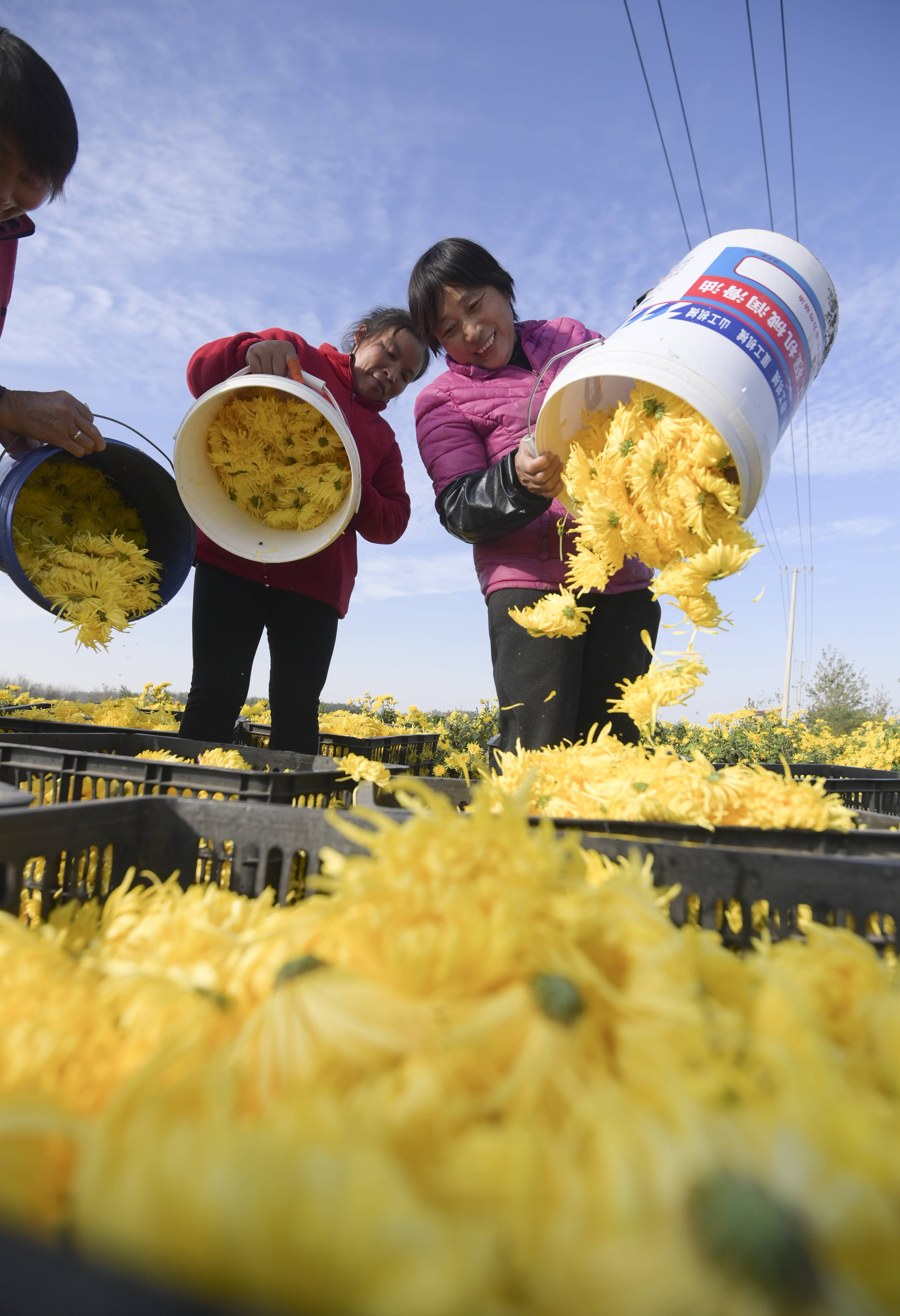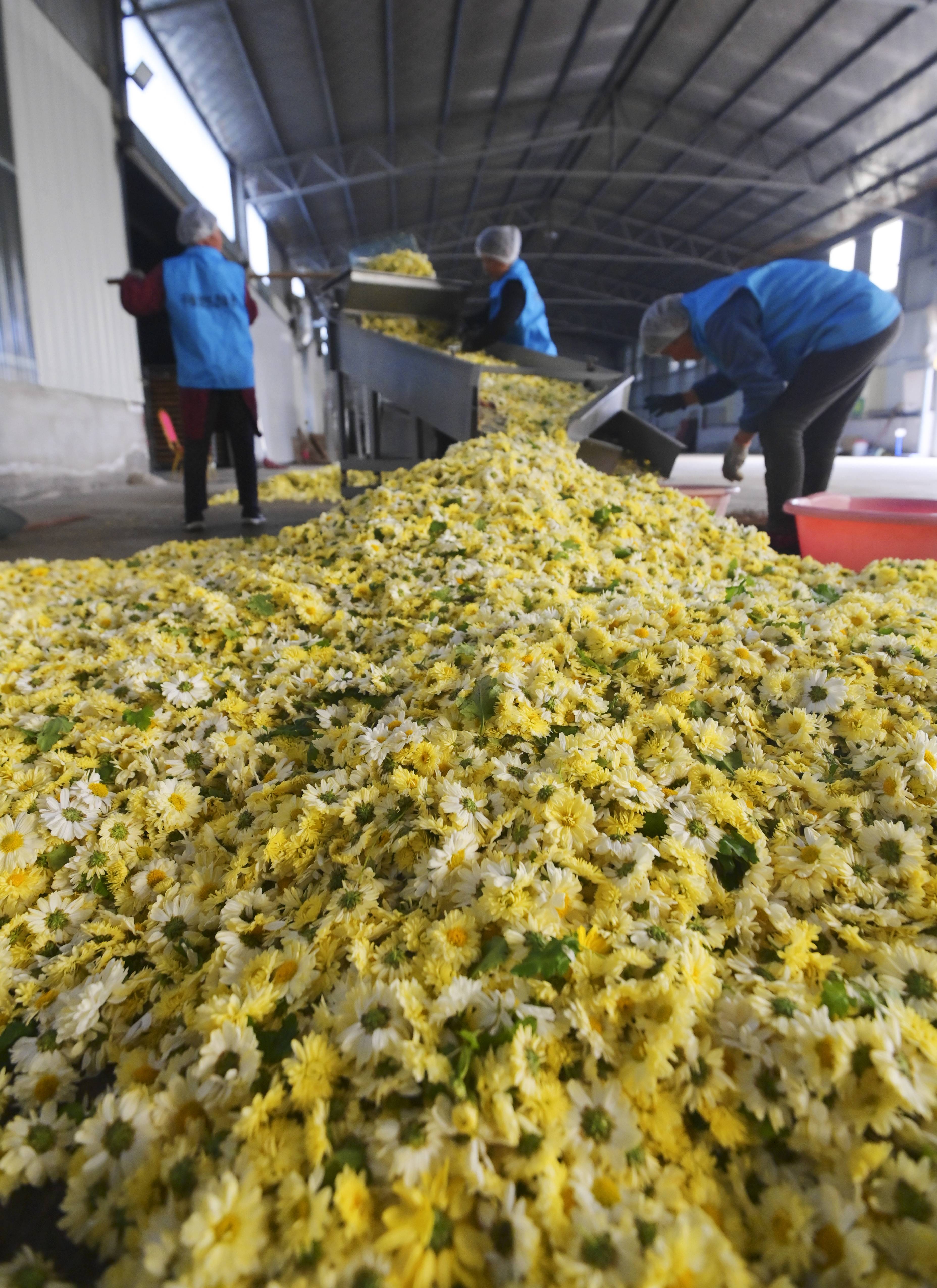 7年前,千植堂开始在洪楼村种植菊花。如今,已由原来种植单个菊花品种,发展到杭白菊、金丝皇菊、婺源菊等多个品种,种植面积近500亩。“现在采摘的鲜菊花每亩产量在1500斤左右,经过深加工亩产效益可达1万多元。”说起菊花,公司负责人张夫亮喜笑颜开。