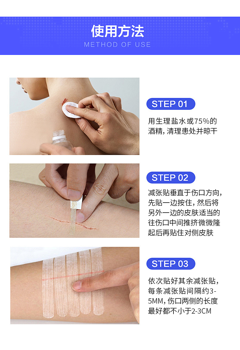 1.术后马上贴,也就是缝合完毕后包扎时就开始贴。当然,如果使用了其他更有力的减张措施,如拉力扣、减张器等,此时就无需使用减张贴。